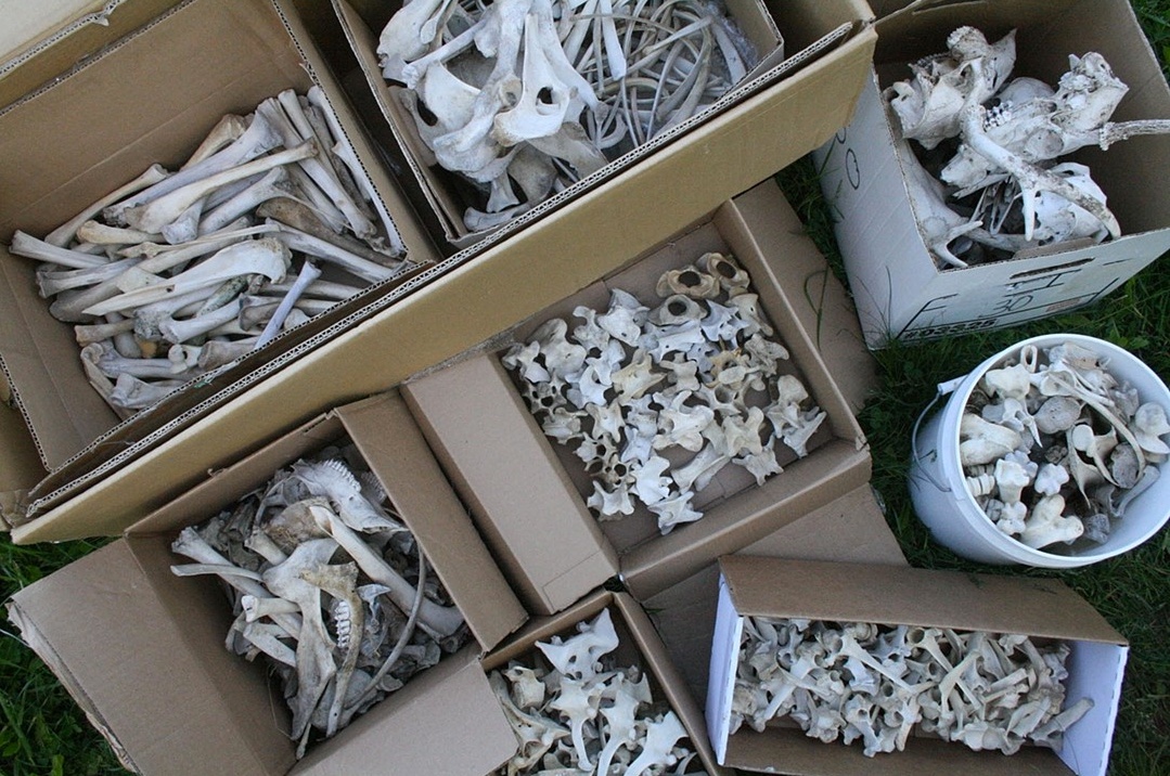 SALVAGE is an installation of rearticulated deer skeletons. I found the bones at an active state highway roadkill dumpsite where the carcasses are discarded at the top of a steep slope above a river. The road crews cover them with wood chips and other dry composting materials. Over time the remains decompose and the hill erodes, gradually moving the bones down the grade. After a few years the bones are clean and deposited in loose soil at the bottom. I’ve been collecting/excavating bones there since 2001. Each skeleton in the herd is made up of bones from many different deer.