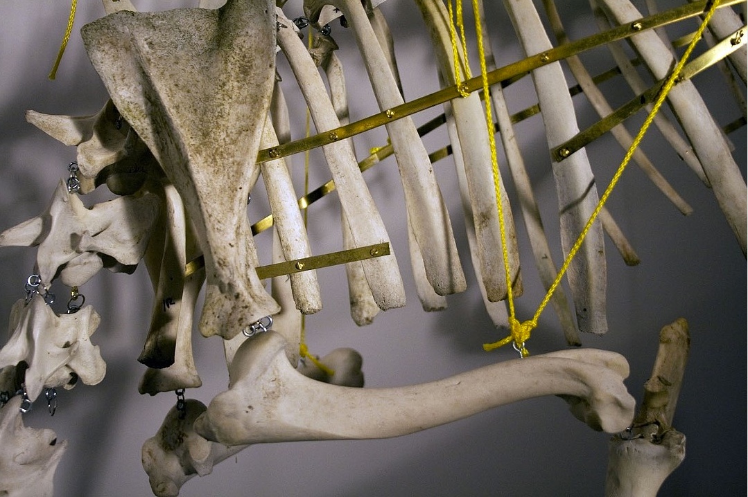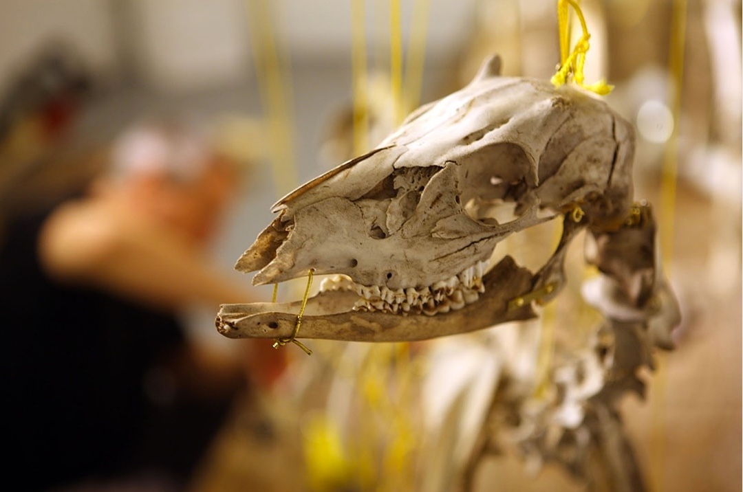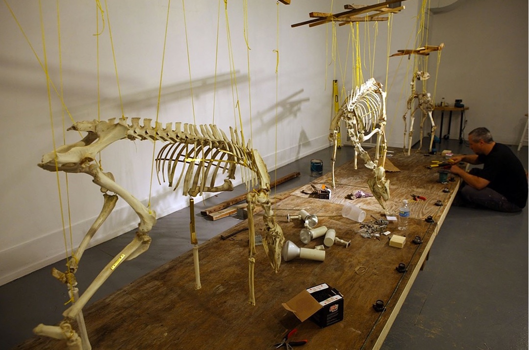 The skeletons of SALVAGE are staged in a pseudo-scientific way. They have been assembled with anatomical accuracy as dinosaur bones are presented in the halls of a natural history museum. But this herd is homemade, not institutional. This distinction serves to memorialize these reconstituted animals. These are not just specimens. The herd is not just rearticulated, but in a sense reanimated, creating a ghostly effect that is simultaneously heightened and purposefully diminished with dramatic lighting and rough staging.